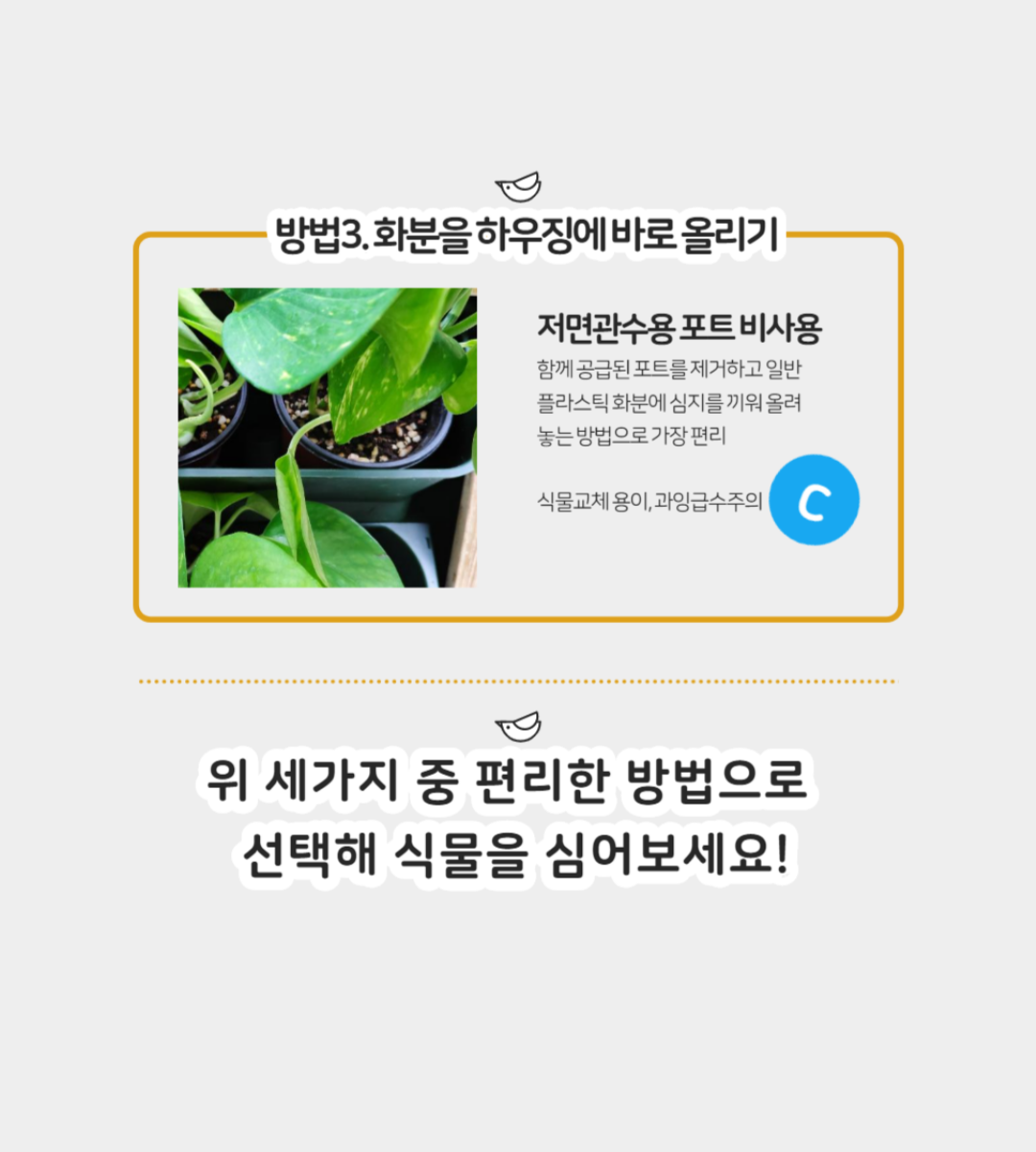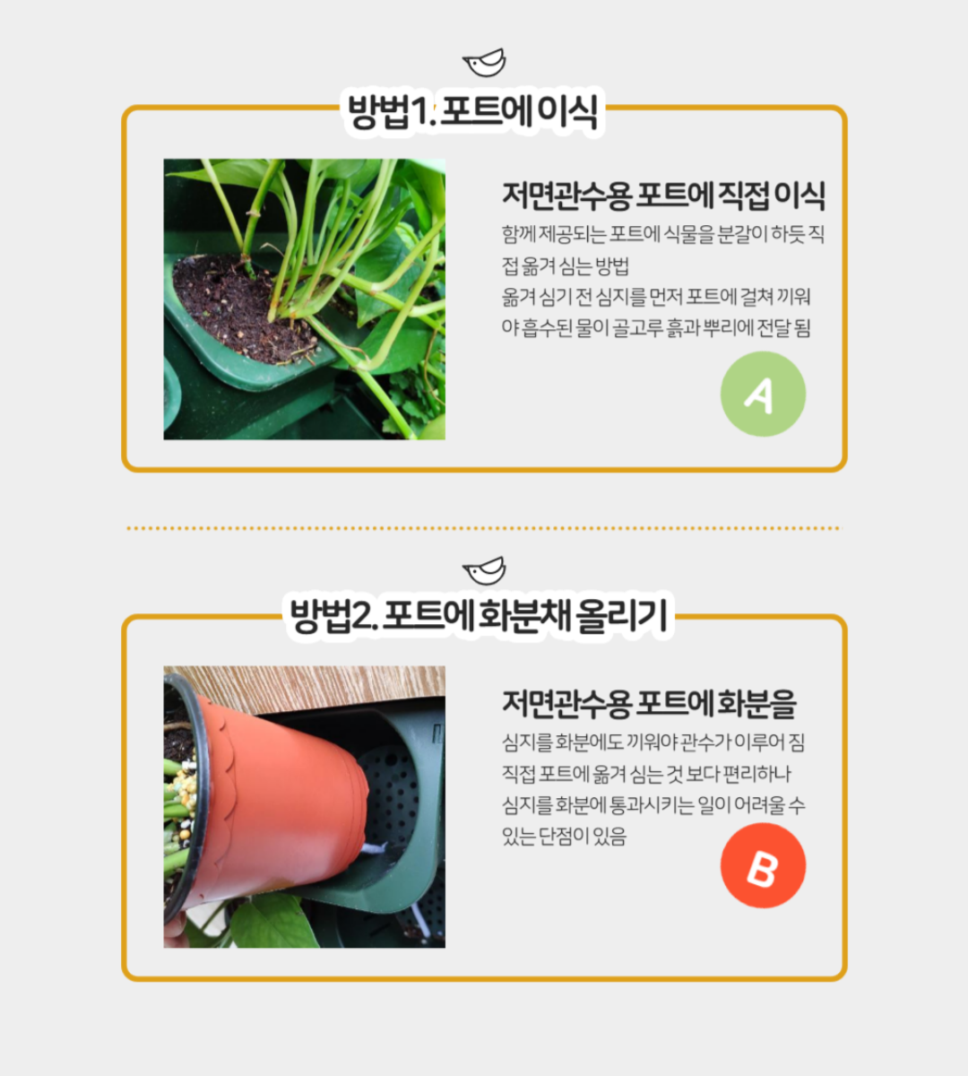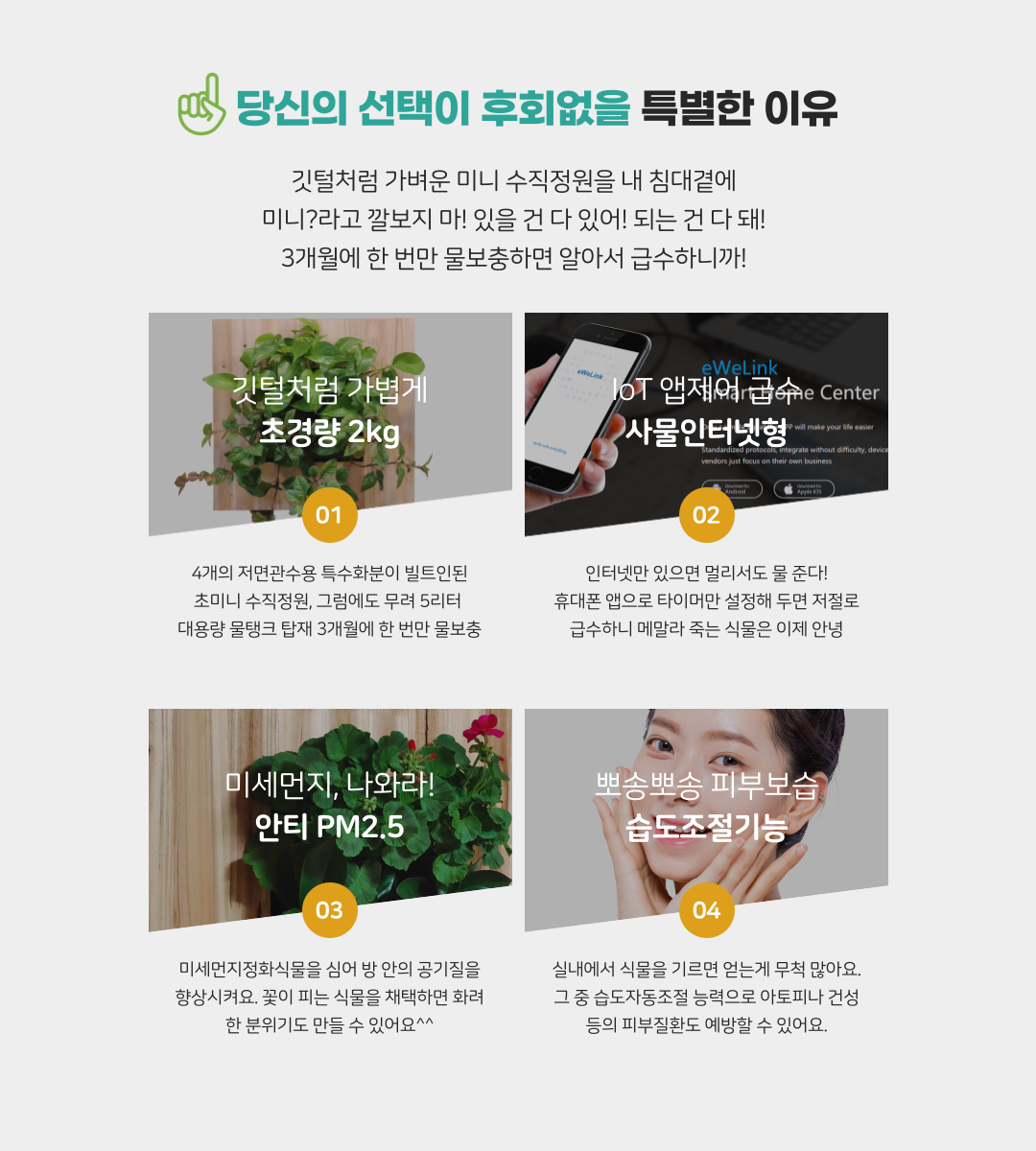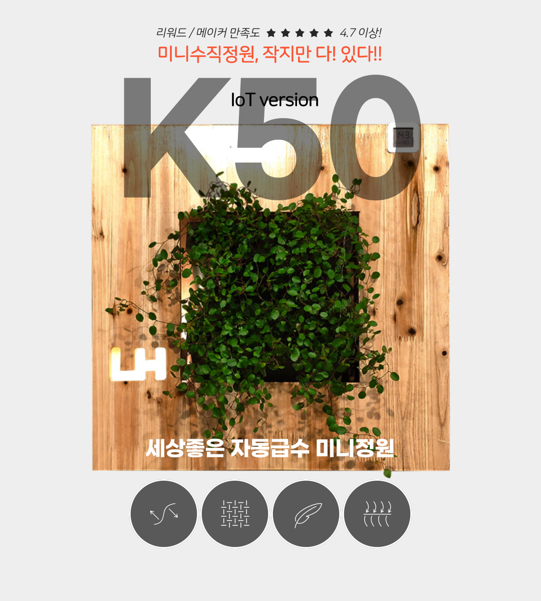 가까운 곳에 급수장치가 있다면 관수장치를 직접 붙일 수 있게 해 줍니다. 관수 주기를 자동으로 조절하기 위해 타이머 달린 밸브를 옵션으로 부착할 수도 있습니다. 최상단 포트에 떨어진 물은 자연스레 아래의 포트로 전달되어 순차적으로 관수합니다.